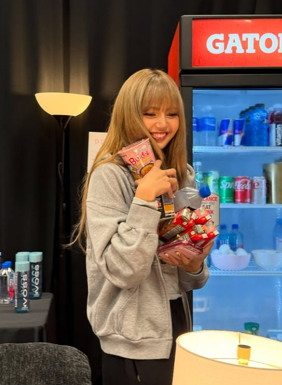 En dehors de la scène, Lisa a partagé des moments chaleureux : rayonnante en loge, sourire aux lèvres, elle enlace un sachet de ramen épicé, affichant une facette naturelle et accessible, proche de celle de ses fans du même âge.