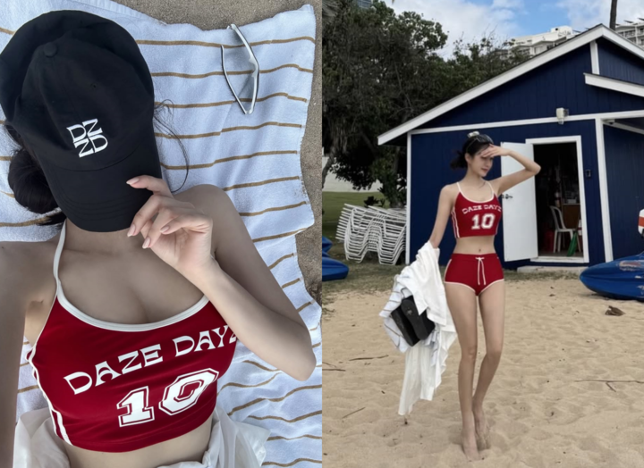 - Hyomin revisite le style sportif avec un beachwear façon football jersey rouge, accessoirisé de casquette noire et de lunettes de soleil, parfait pour un mood Y2K dynamique. Elle se distingue aussi avec un bikini à fleurs style bralette, associant motifs classiques et audace estivale.
