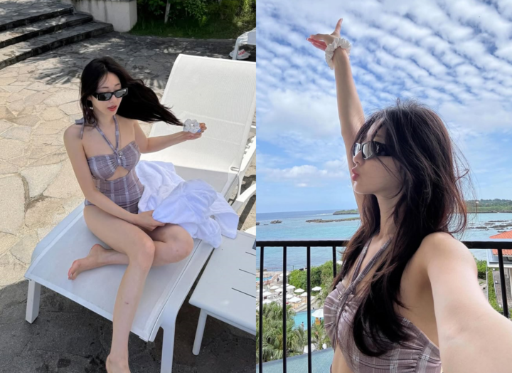 - Kyungri opte pour une monokini à carreaux beiges, rehaussée de détails cut-out et d’un col halter, pour une allure mature et raffinée.
